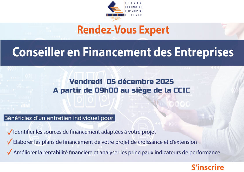 Dans le cadre de l’accompagnement des entreprises de la région du centre pour le développement de leurs activités, nous avons le plaisir de vous informer que la CCIC organise une séance de Rendez-vous Expert avec :